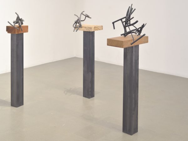 The steel constructions are balanced on the edge of blocks of wood, which are then placed on top of pillars of hollow steel box section. Their positions imply they are interacting with the different materials and sculptural parts, and with space and gravity.